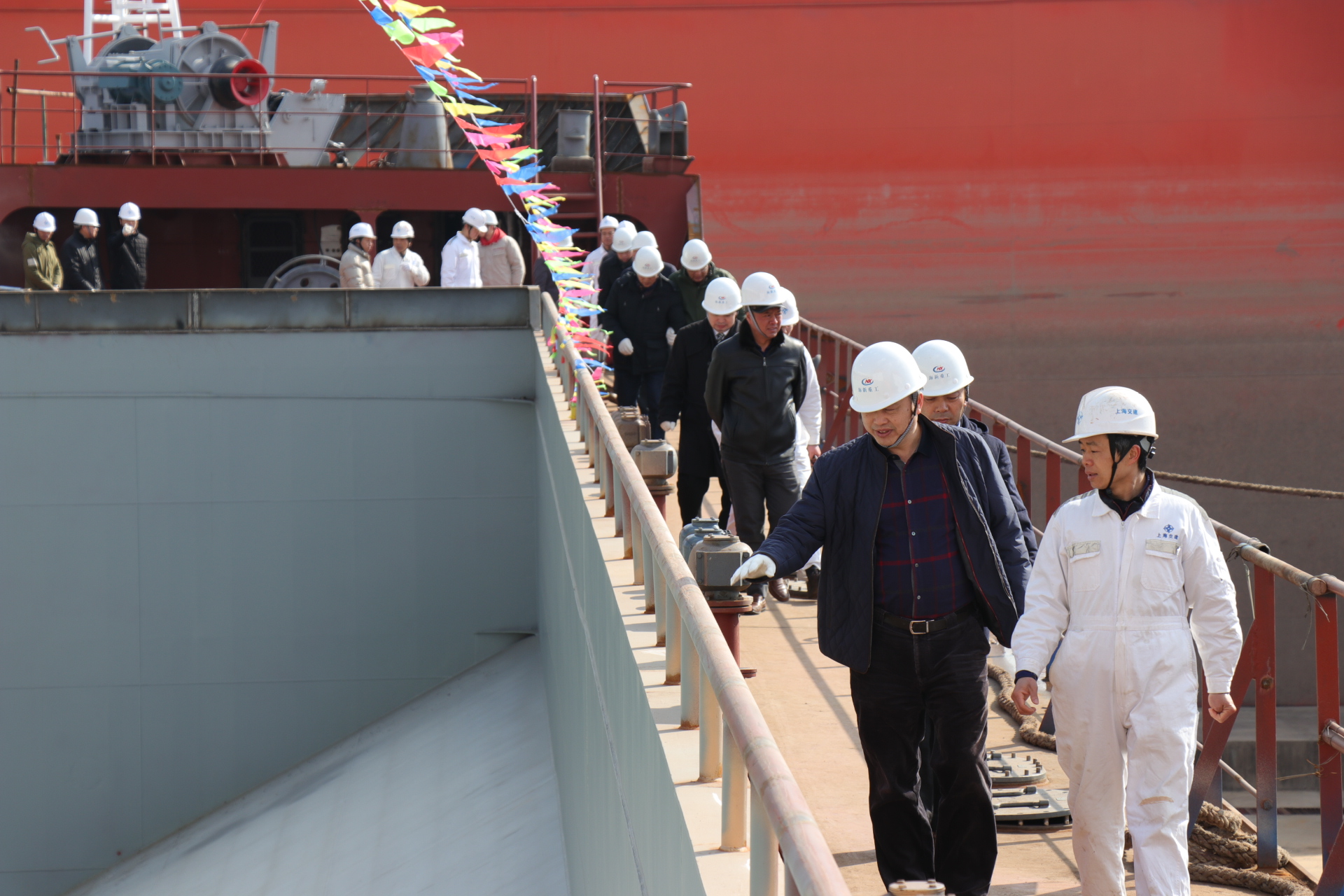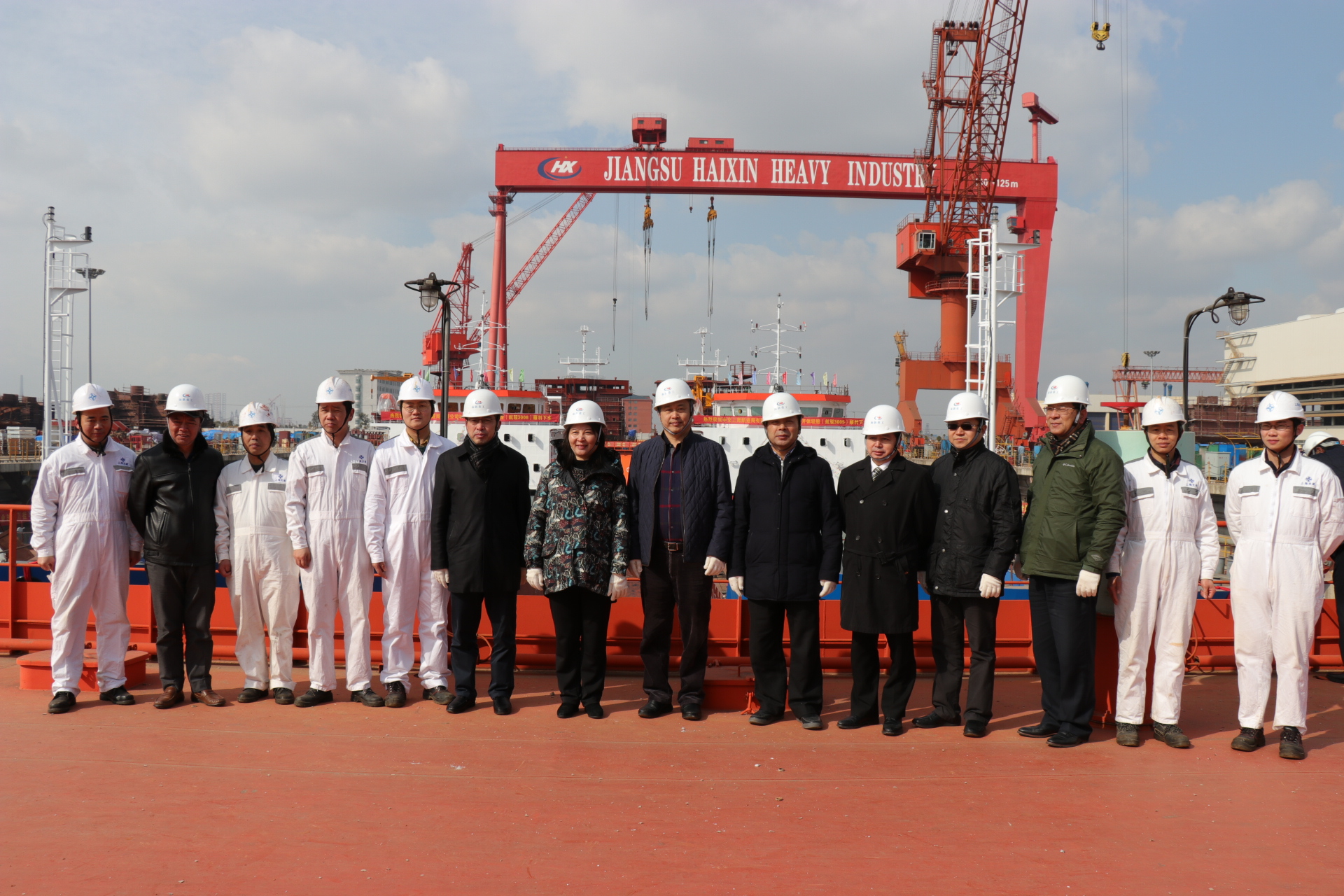 江蘇海新重工副董事長(zhǎng)陳五洲主持下水儀式。中交上海航道局有限公司侯曉明董事長(zhǎng)充分肯定了江蘇海新重工對(duì)本次建造的3000 m³自航開體駁付出的努力,并且要求海新再接再厲,盡快完成船舶交付工作。在聲聲爆竹聲中由海門市市長(zhǎng)郭曉敏女士完成了“擲瓶禮”,香檳在船頭摔得粉碎,預(yù)示這兩艘新泥駁船將永遠(yuǎn)航行平安,隨后工人打開了塢門水泵,最終儀式在江水涌出后沖擊形成的陣陣水花中結(jié)束。