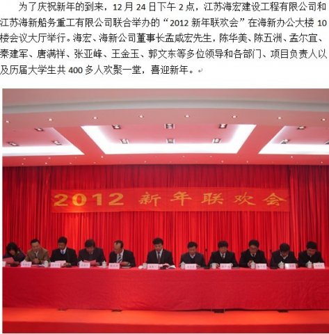 2012年1月30日下午2:00,海新重工全體員工歡聚一堂,在公司10樓會(huì)議大廳舉辦了2012新春聯(lián)歡會(huì)活動(dòng)?;顒?dòng)在公司副總經(jīng)理陳五洲先生的主持下進(jìn)行,首先由各部門負(fù)責(zé)人及員工代表發(fā)言...